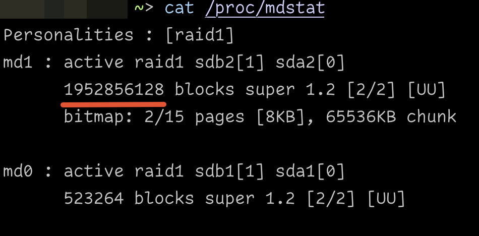 Before we can encrypt the RAID drive, we need to identify which one is bound to /. We can see this by running cat /proc/mdstat. We want the largest one: