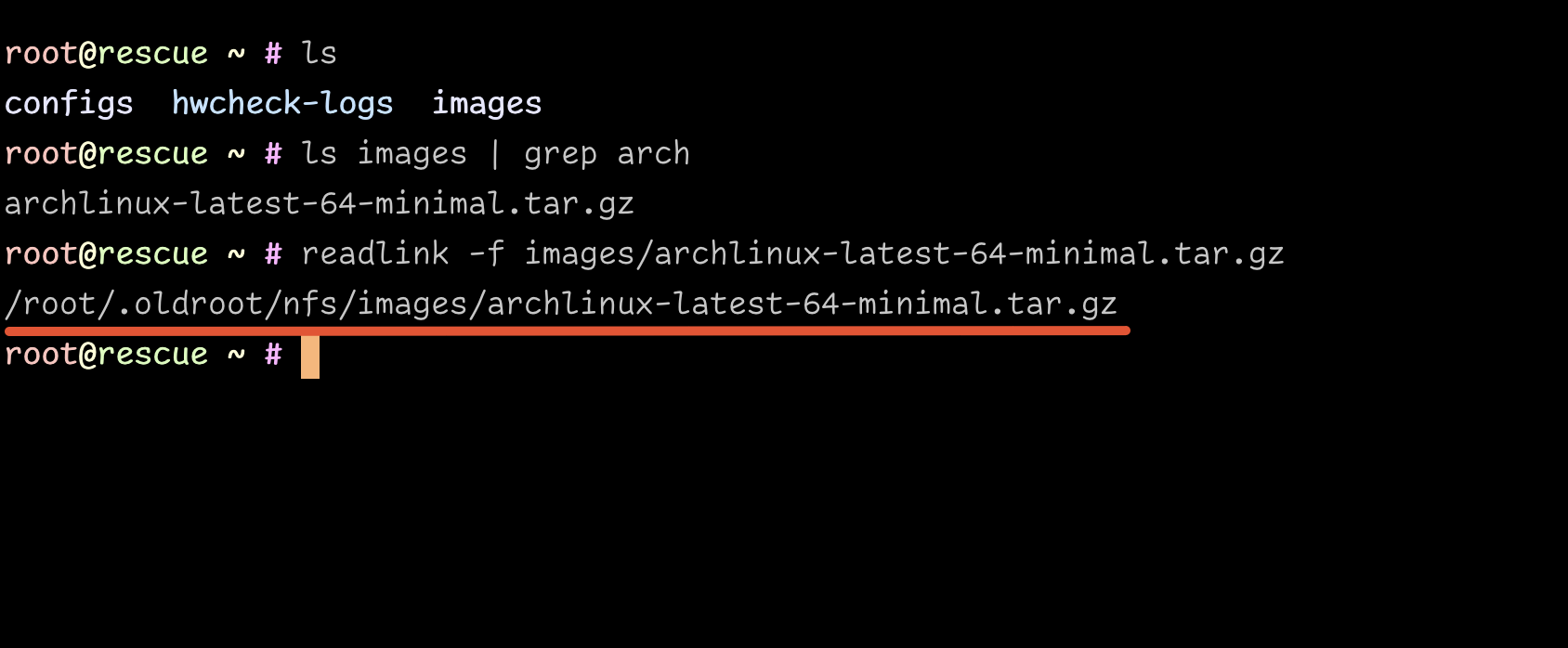 For the installation image filepath, there’s a symlink, images, within the root home directory, which contains all the systems the Hetzner installer has opted to carry. Identify the Arch Linux one and take note of the filepath: