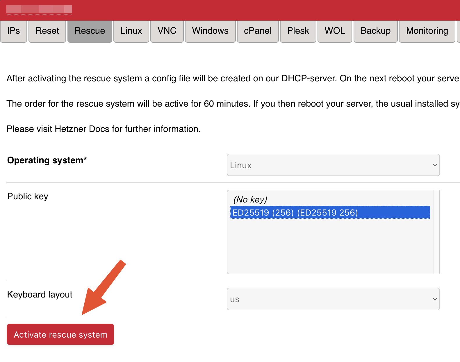 To do this we have to set the server to boot rescue mode on the next boot-up. Login to Robot and mark it for rescue mode and reboot the server.